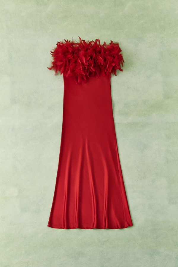 L'abito in elastan è caratterizzato da un tessuto morbido e flessibile che si adatta perfettamente alle tue forme. La sua gonna midi svasata ti garantirà un look elegante e femminile, mentre l'elastico in vita e il bordo in piume aggiungeranno un tocco di originalità al tuo outfit.